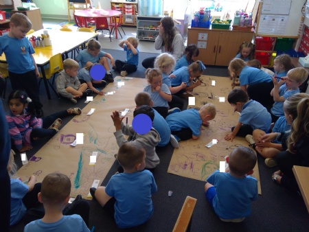 During our first handwriting session, reception class were learning how to write their names. The children used felt tip pens and had a copy of their names in front of them so they could practise drawing the letter shapes correctly. They drew self-portraits to go alongside their names. The class enjoyed working collaboratively with their friends.